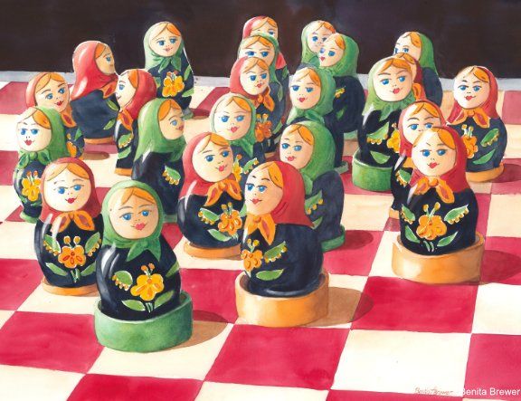 I found this set of Russian nesting dolls checker set and love the all-female characters. When the women become “queened” they have little risers to stand on and even when set up as opposing teams, they still appear to work together.